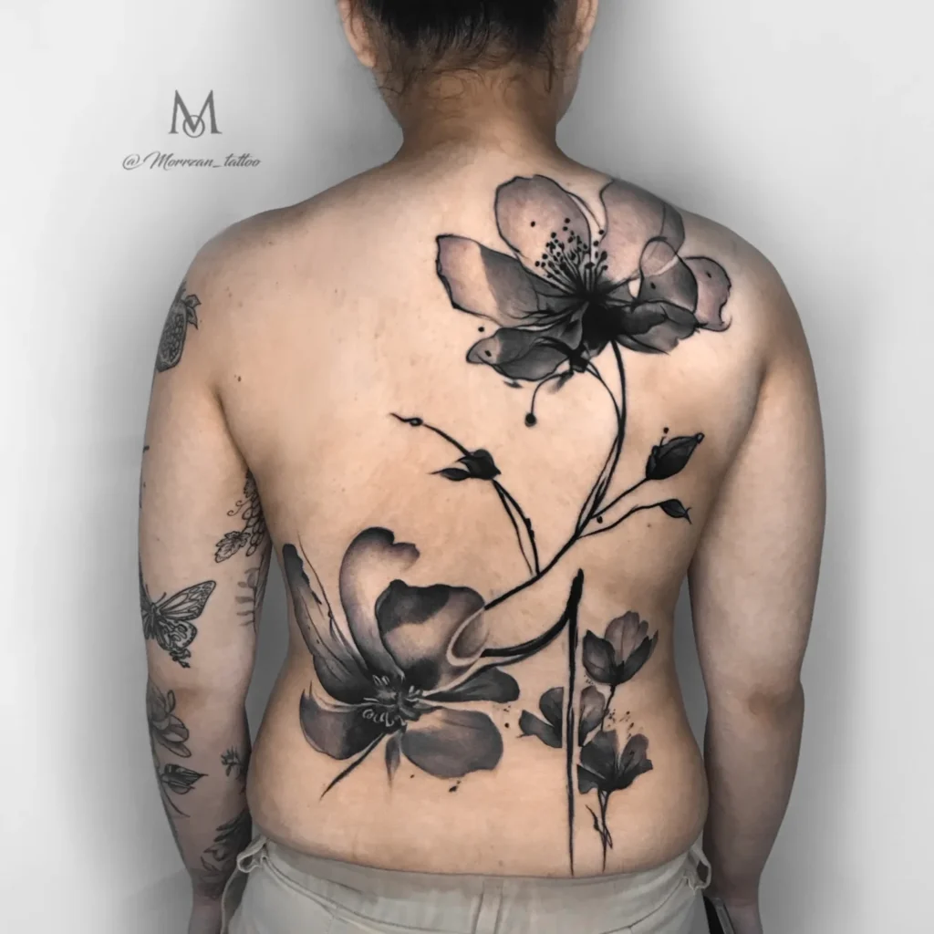 With blooms placed on the upper shoulders and lower back, the design draws the eye along the spine, adding elegant flow. The subtle shading highlights each petal, giving the flowers depth and realism.