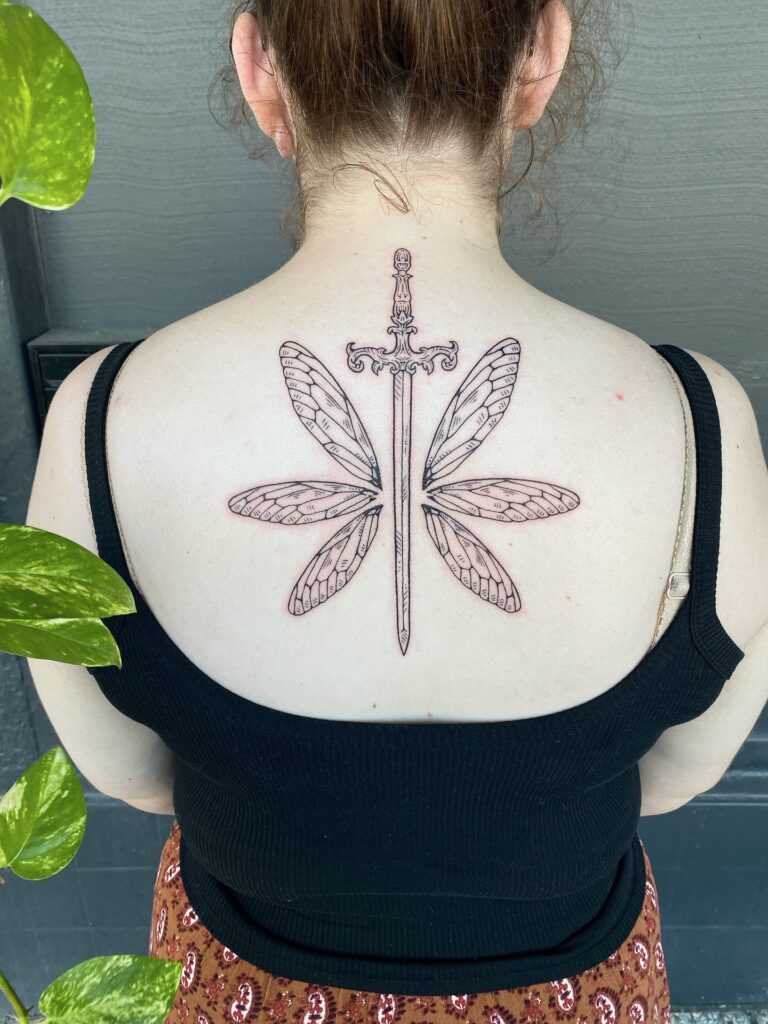Subtle linework captures the veins in each wing, creating a natural, magical texture. The sword’s ornate hilt provides a medieval touch, giving the design a storybook, fantasy vibe.