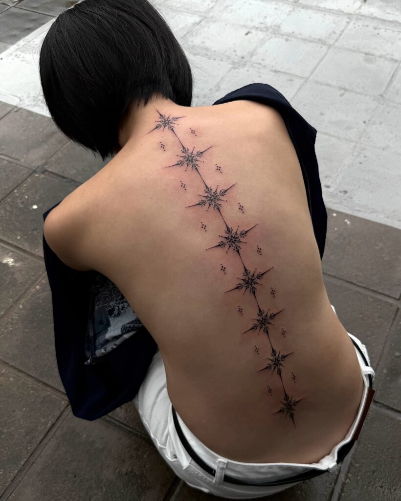 This striking tattoo features a graceful trail of shimmering star-like ornaments perfectly aligned along the spine.