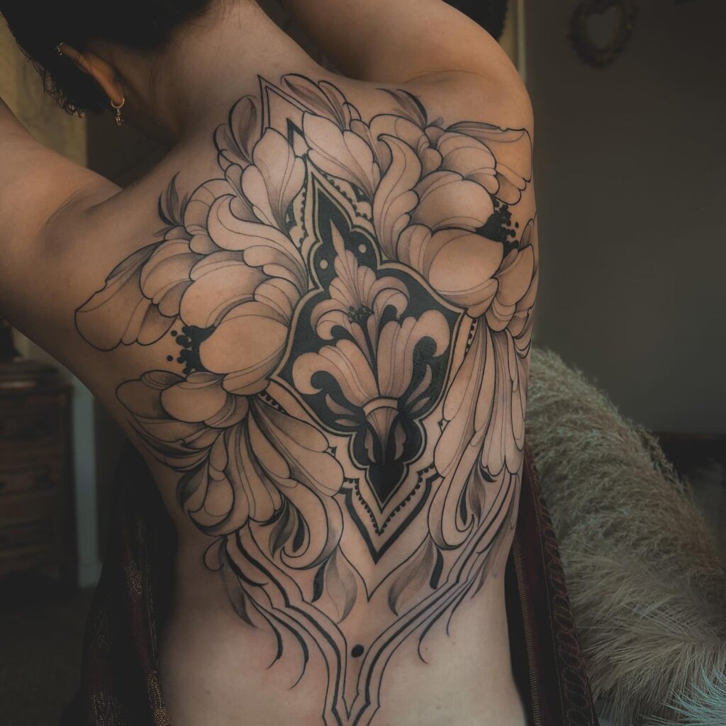 The balance of heavy black sections and light, airy petals creates depth and harmony. This tattoo beautifully combines ornamental motifs with natural floral elements, creating a captivating full-back statement piece.