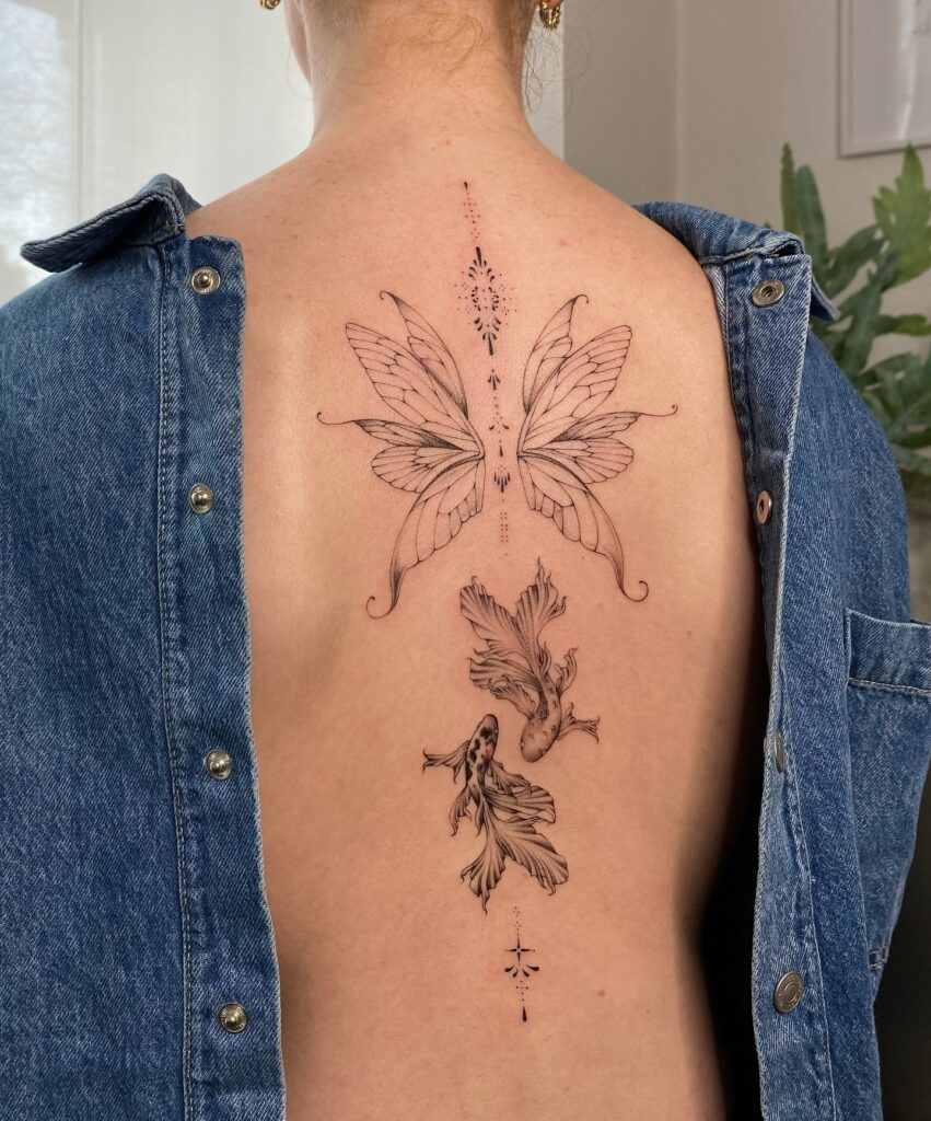 Graceful Butterfly and Koi Fish Back Tattoo