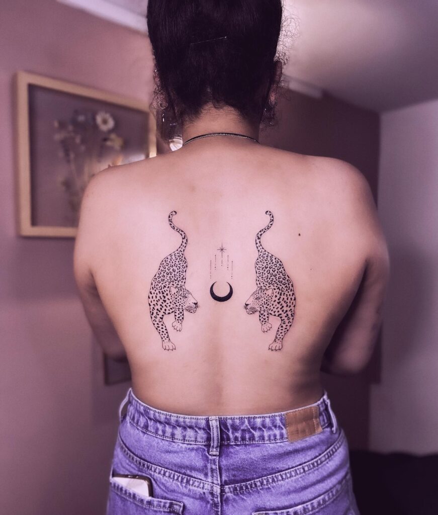 This symmetrical back tattoo features two detailed leopards facing each other, their bodies curved in perfect balance.