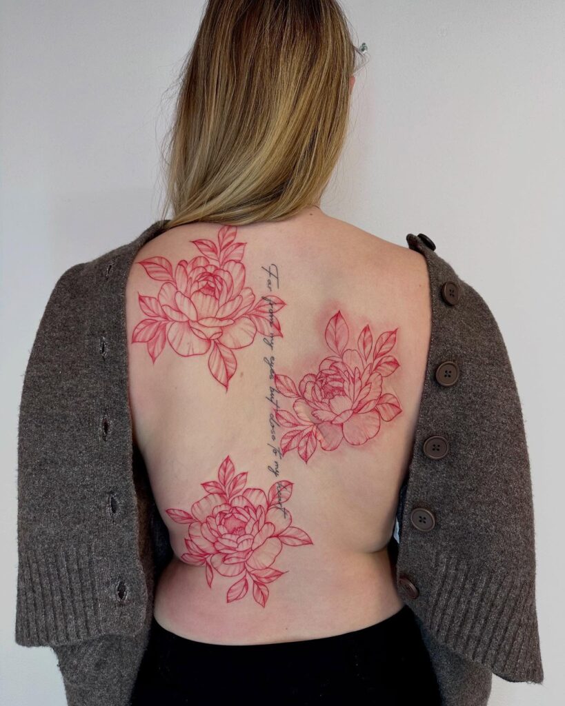 Red Peony and Script Back Tattoo