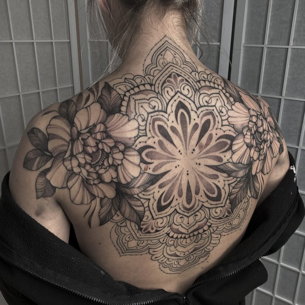 Ornamental Mandala Back Tattoo with Blackwork Accents