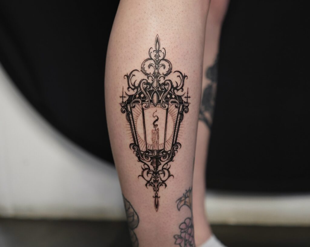 This gothic tattoo features an ornate lantern design, framed with elaborate flourishes resembling wrought iron cathedral details. At its center, a candle burns faintly, its smoke curling upward in a delicate wisp.