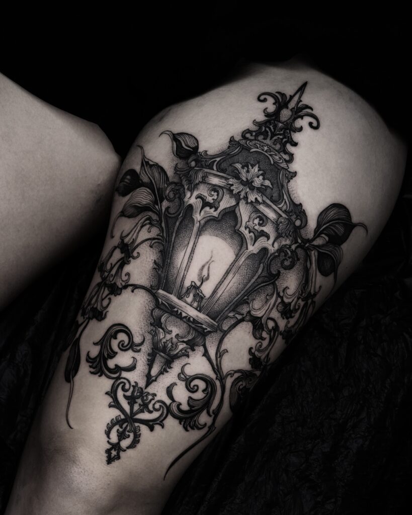 Its intricate shading creates a dramatic sense of texture, giving the lantern a lifelike, three-dimensional presence. Placed on the thigh, this piece embodies gothic symbolism of mystery, faith, and illumination within shadows, making it both haunting and graceful.