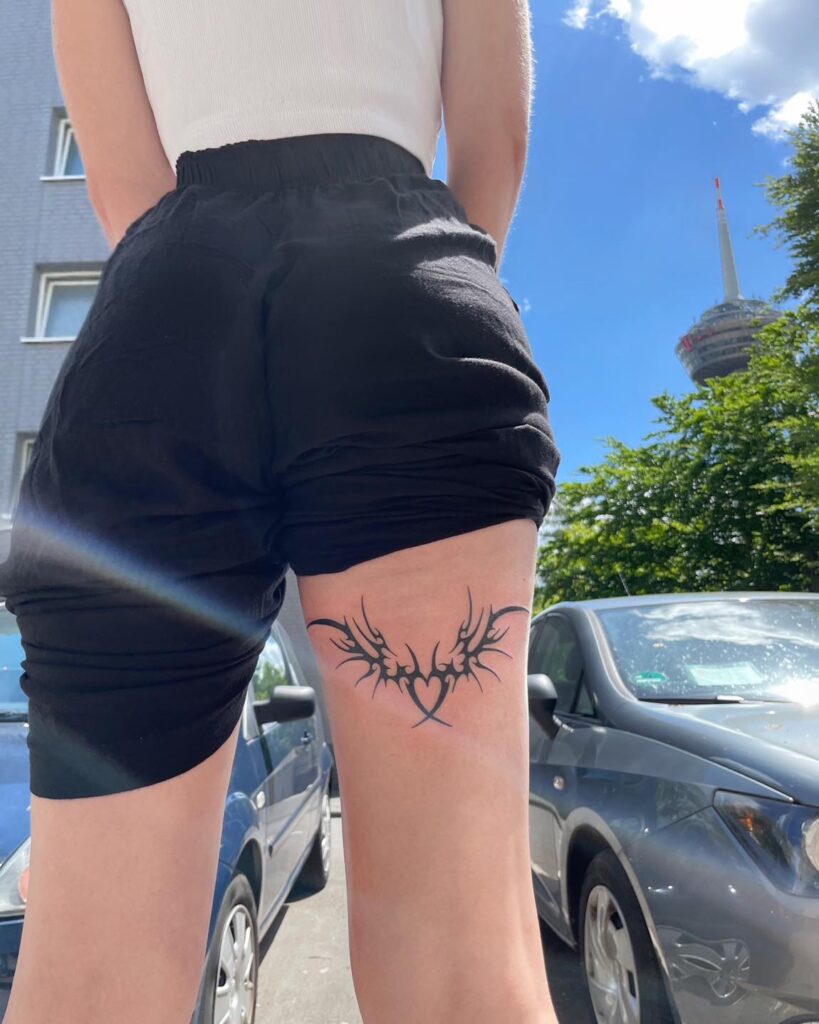 Placed on the thigh, the design stands out with powerful contrast and dark elegance. It’s a perfect gothic piece, symbolizing transformation, darkness, and the unseen beauty of the night.
