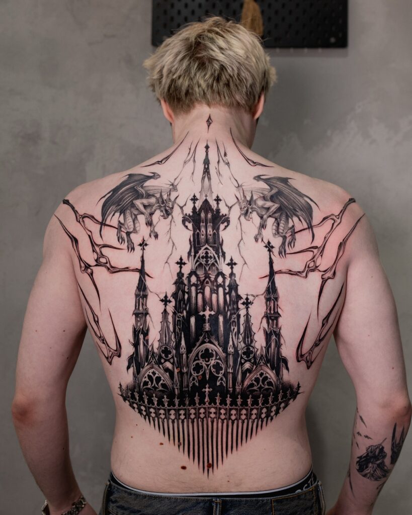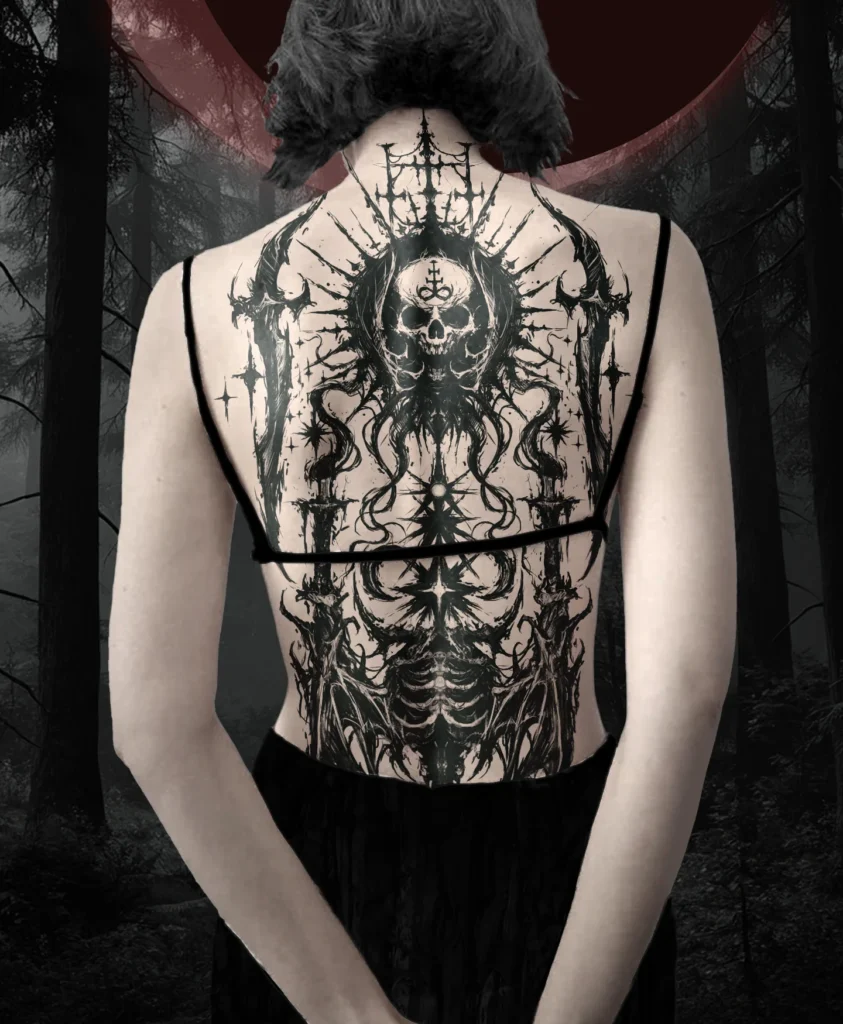 The sheer size transforms the entire back into a dark canvas of gothic storytelling. With its intricate symmetry and bold presence, this tattoo embodies gothic grandeur, merging death imagery with sacred symbolism in a striking, unforgettable masterpiece.