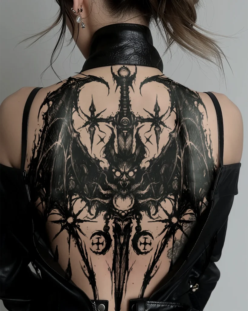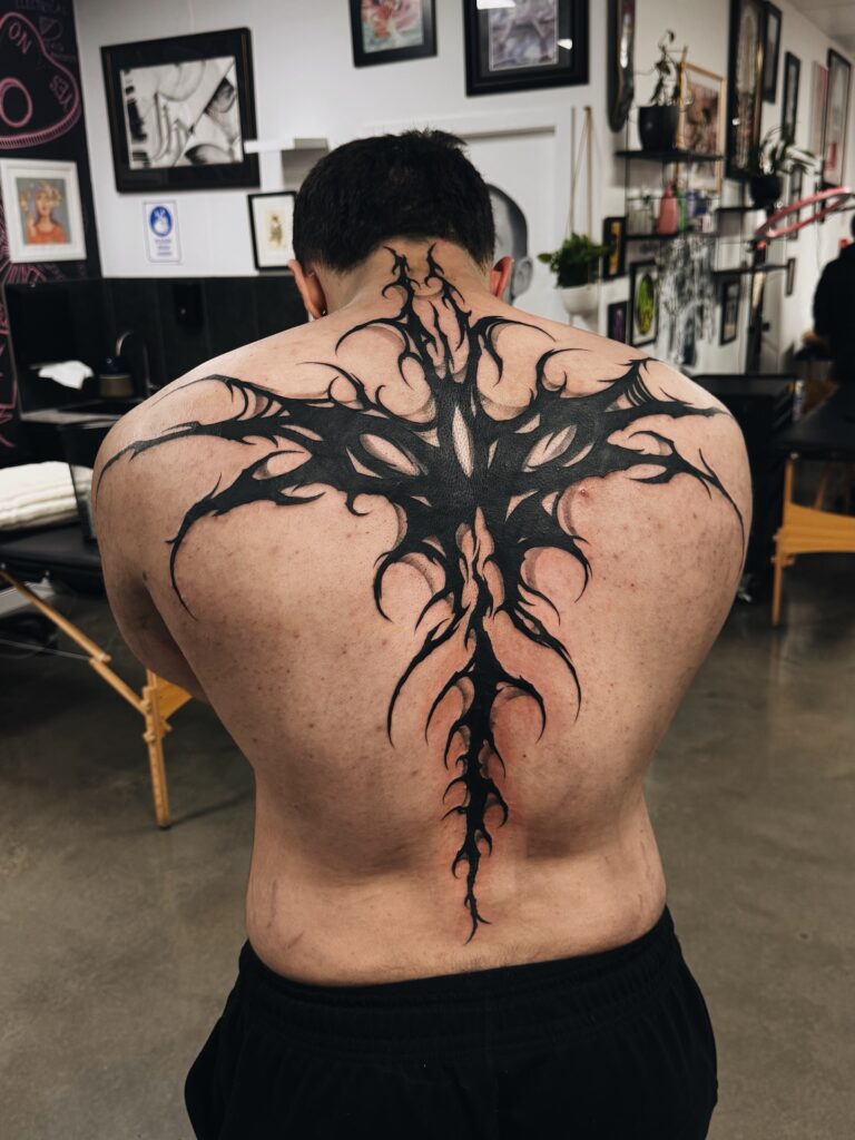 This gothic tattoo spreads across the entire back, forming a cross made of sharp, flame-like extensions.