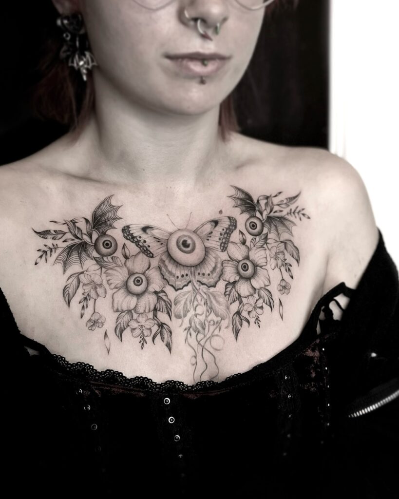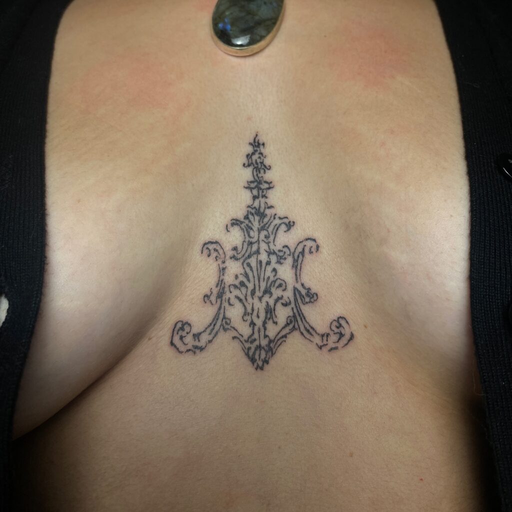 This gothic tattoo features a delicate ornamental design placed at the sternum, creating an elegant yet mysterious centerpiece.