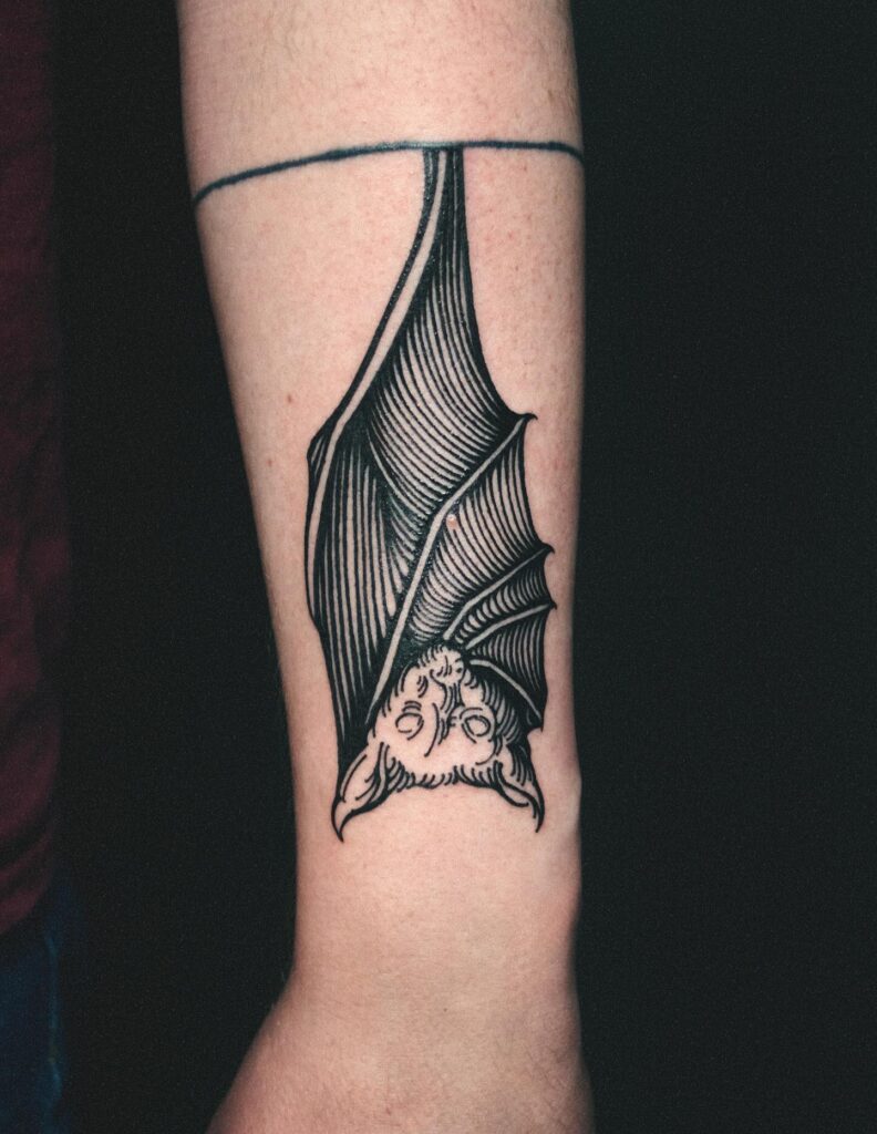 This tattoo embodies gothic fascination with night creatures, blending horror and elegance into a powerful forearm piece filled with shadowed beauty.