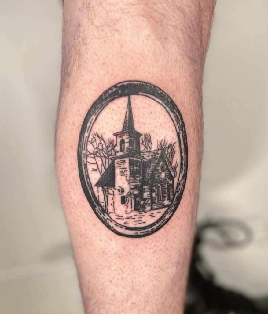 The framing is sharp and ornate, echoing church spires and timeless stonework. Its luminous effect captures gothic reverence while adding a modern artistic twist. Placed on the arm, this tattoo radiates elegance, transforming gothic architecture into a glowing masterpiece on skin.