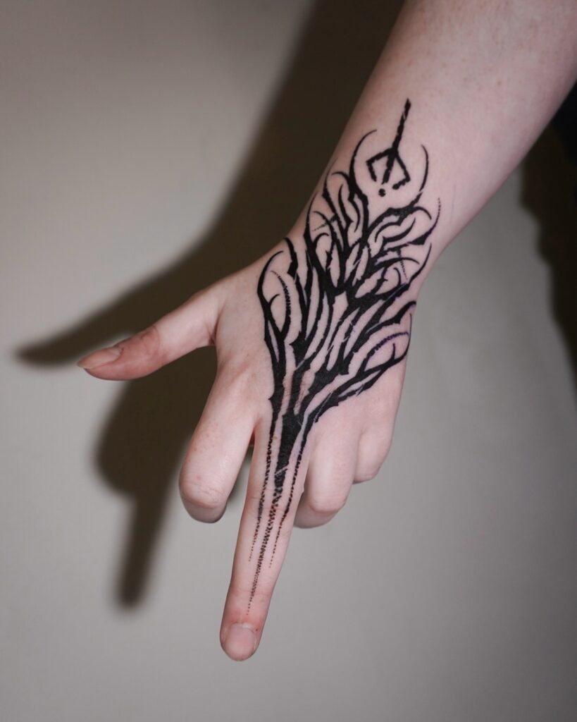 Its sharp, curling forms give the impression of energy in motion, creating a design that feels both chaotic and elegant. The placement enhances its movement, making it appear as though the patterns are alive on the skin.