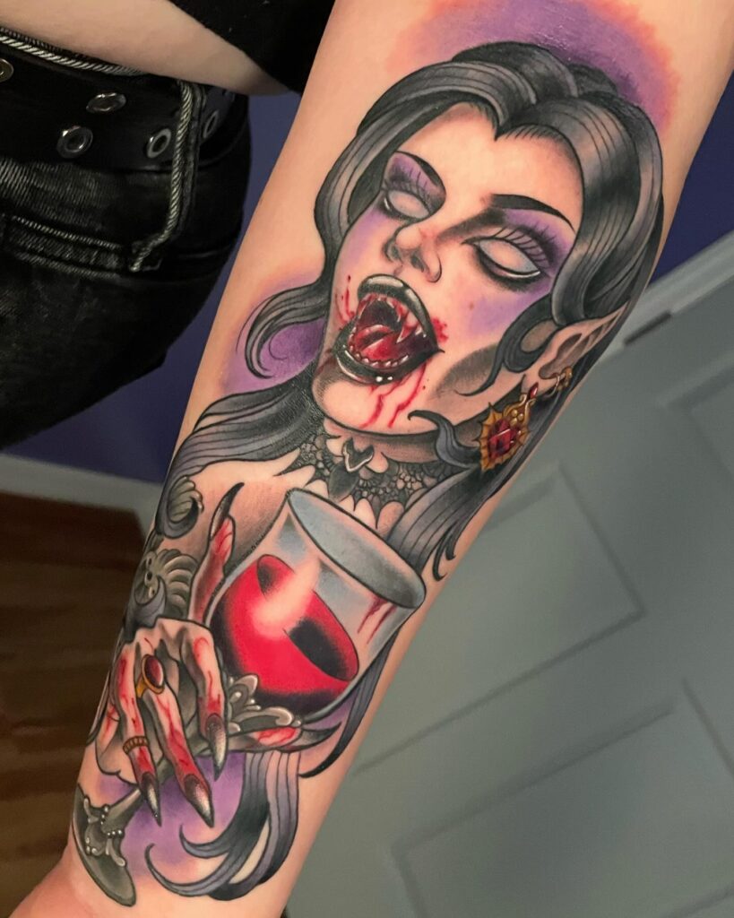 This gothic tattoo portrays a seductive vampire woman with fangs bared, blood dripping from her mouth in chilling detail.