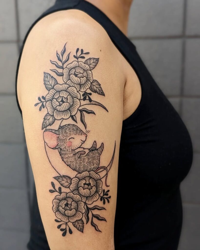 This charming upper arm tattoo features a sleepy little mouse tucked comfortably among a lush arrangement of blooming roses. The gentle curves of the mouse and intricate shading in its fur add softness and warmth to the design.