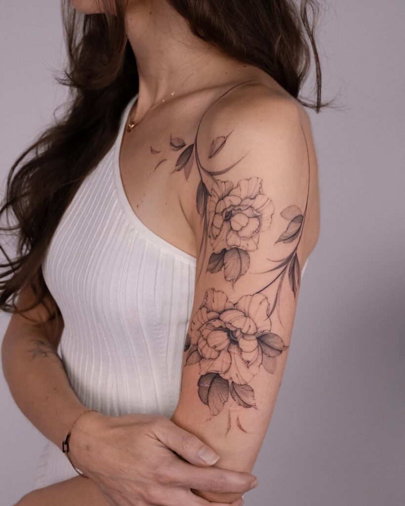 This stunning upper arm tattoo features two large, delicately shaded peonies surrounded by softly swirling vines and leaves. The design wraps naturally around the arm and shoulder, creating a graceful flow that enhances the body’s contours.