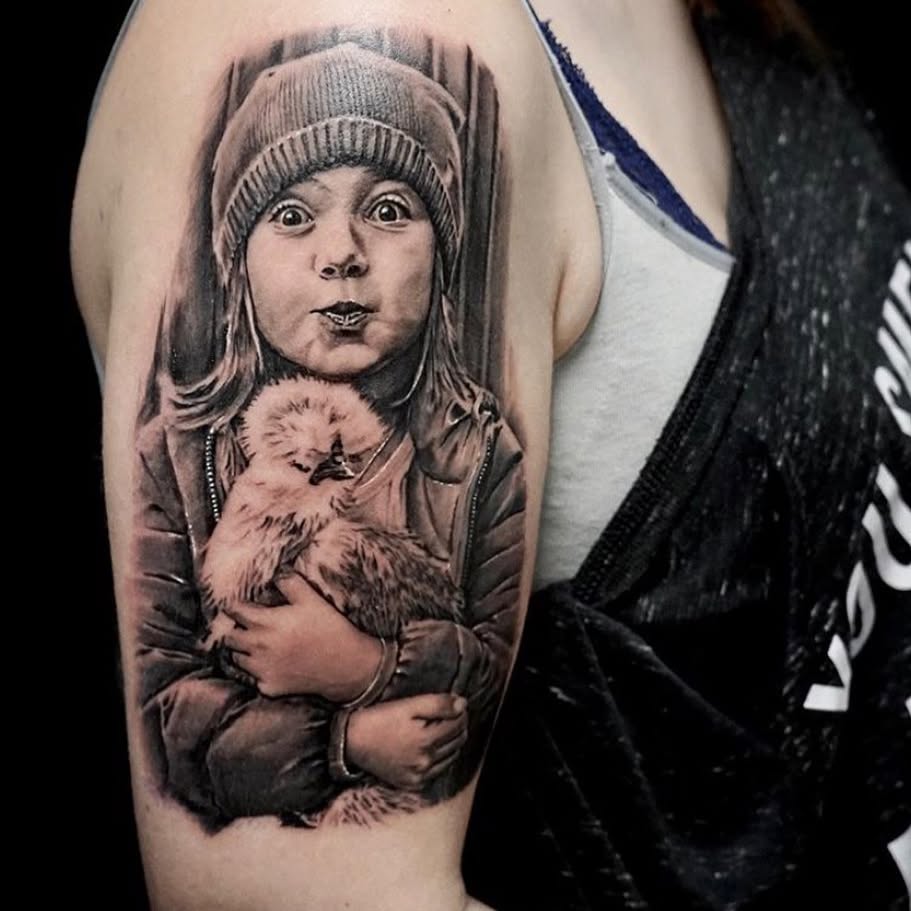 This beautifully detailed black-and-gray tattoo is a heartfelt portrait of a daughter warmly hugging her pet chick. Her playful expression and cozy beanie give the design a sense of joyful innocence, while the intricate shading brings every strand of hair and feather to life.