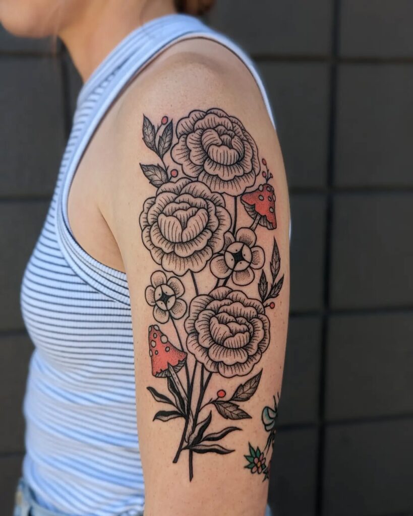 Whimsical Roses and Mushrooms Upper Arm Tattoo
