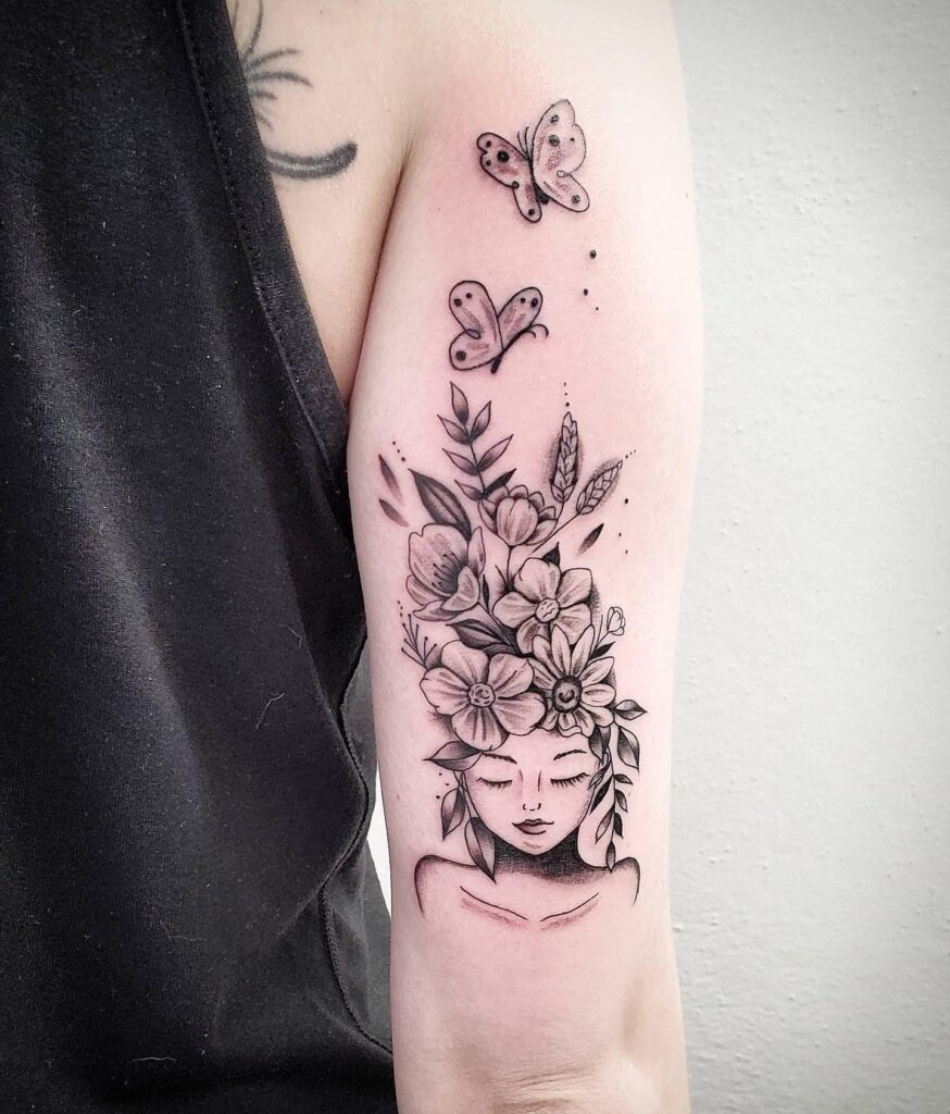 Above her, two whimsical butterflies float, bringing a light, airy energy to the design. The fine black shading and intricate detail in both the flowers and butterflies give the piece a soft, dreamy aesthetic. Perfect for someone who appreciates nature-inspired tattoos with a touch of quiet beauty.