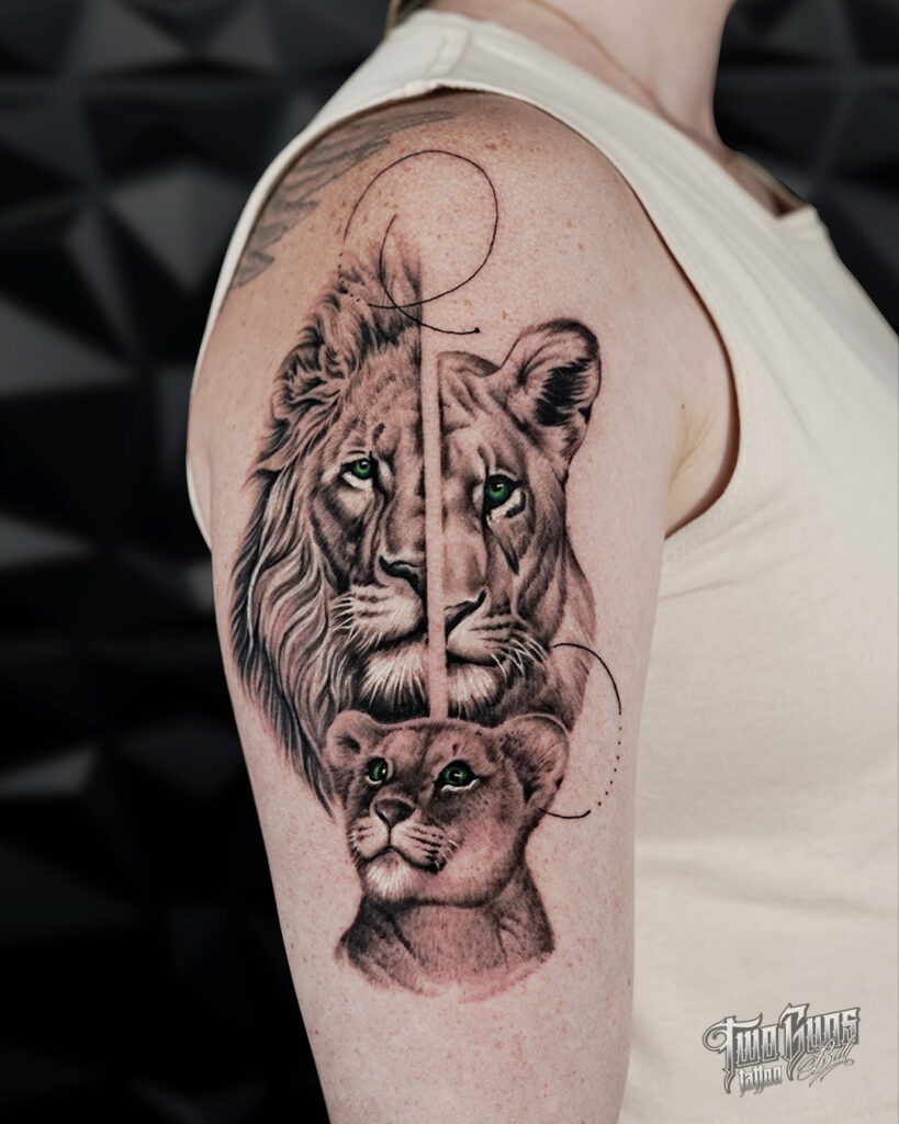 This captivating upper arm tattoo features a powerful lion and lioness, split symmetrically down the middle, with a lion cub looking upward beneath them. The design is highly detailed, using smooth shading to give the animals depth and realism.