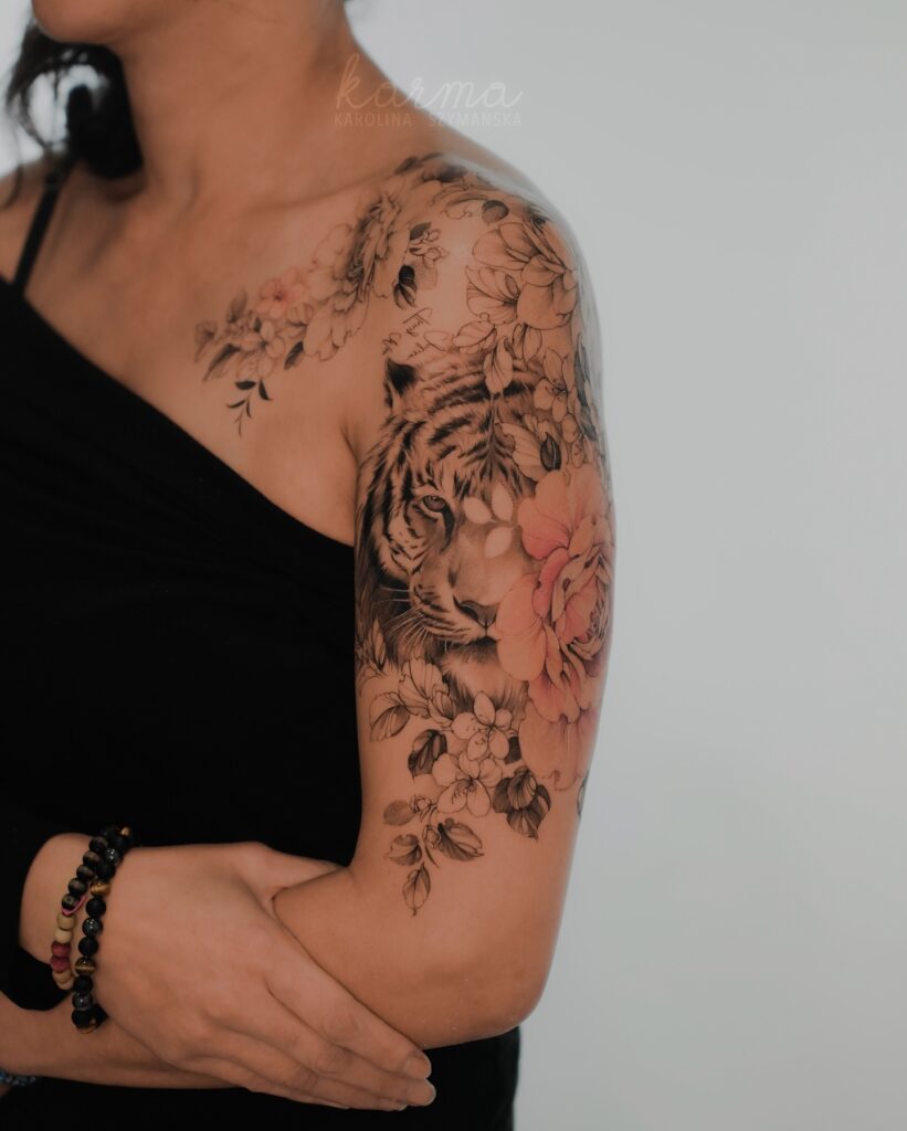 This breathtaking upper arm tattoo features a powerful tiger face nestled among delicate floral blooms. The tiger’s gaze is captivating, creating a striking contrast between its strength and the softness of the surrounding petals.