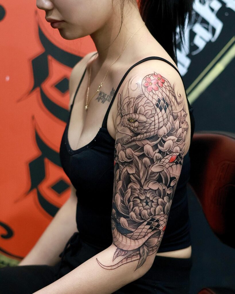 This captivating upper arm tattoo features a powerful snake coiled gracefully around bold chrysanthemum blooms. The serpent’s scales and intense gaze add a sense of strength and movement, while the intricate petals and soft shading of the flowers bring balance and beauty.