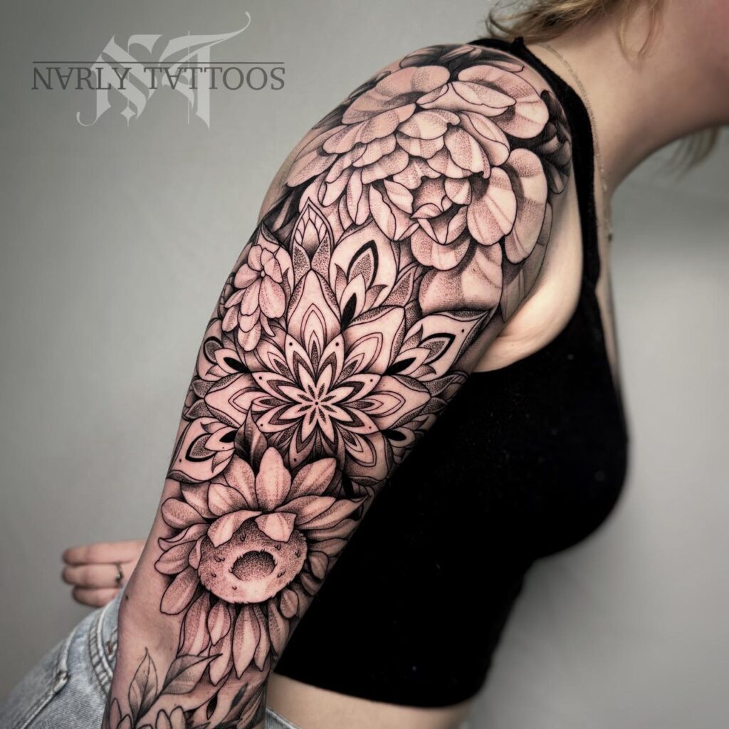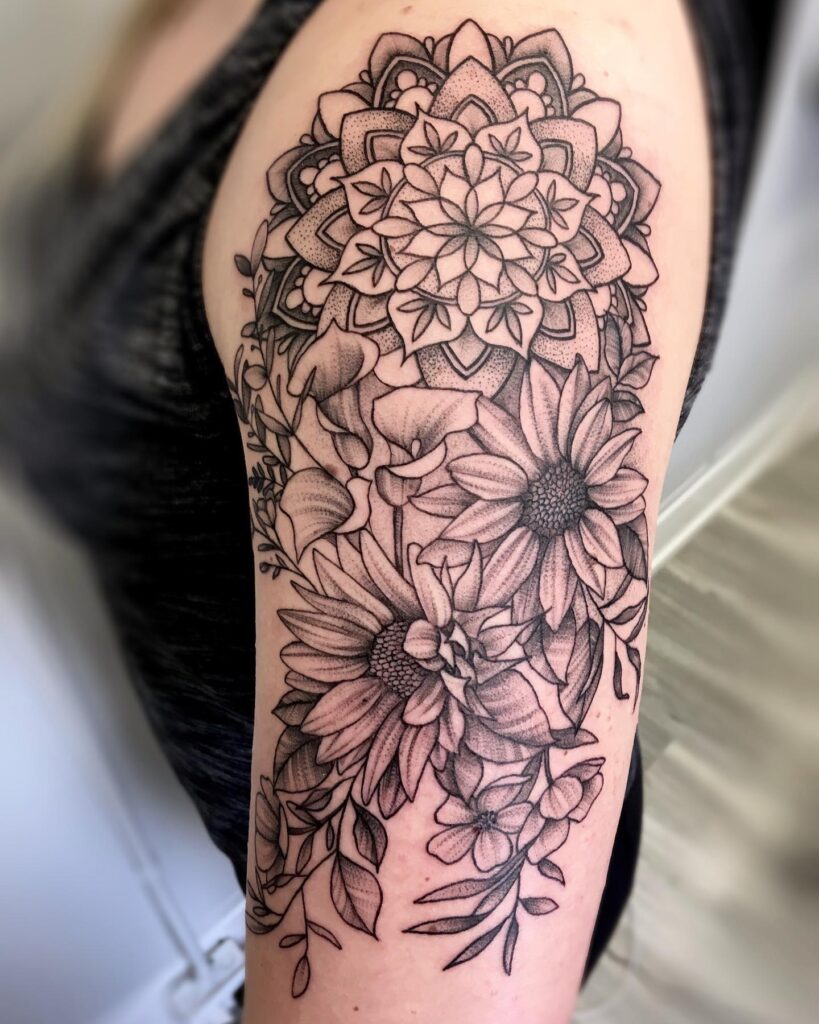 This graceful upper arm tattoo features large, softly shaded blossoms intertwined with delicate leaves and graceful branches. Behind the flowers, intricate mandala patterns created with fine dotwork add an elegant and geometric backdrop, creating depth and visual balance.