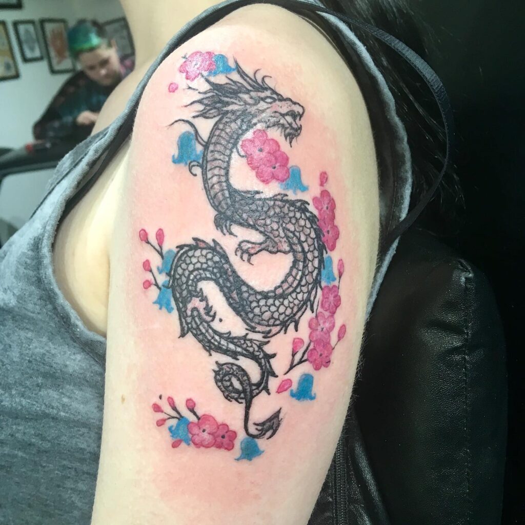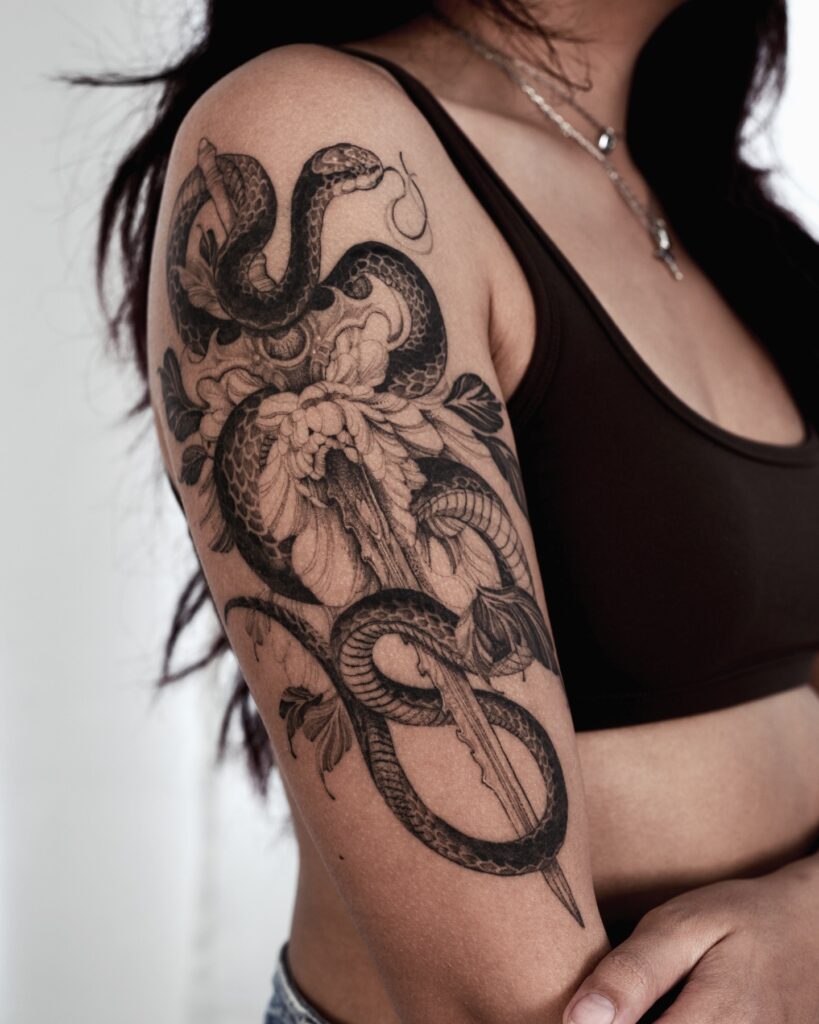This bold upper arm tattoo features a coiled snake wrapped gracefully around a detailed sword, surrounded by lush floral blooms. The sharp blade contrasts beautifully with the intricate shading of the snake’s scales and soft, flowing petals.