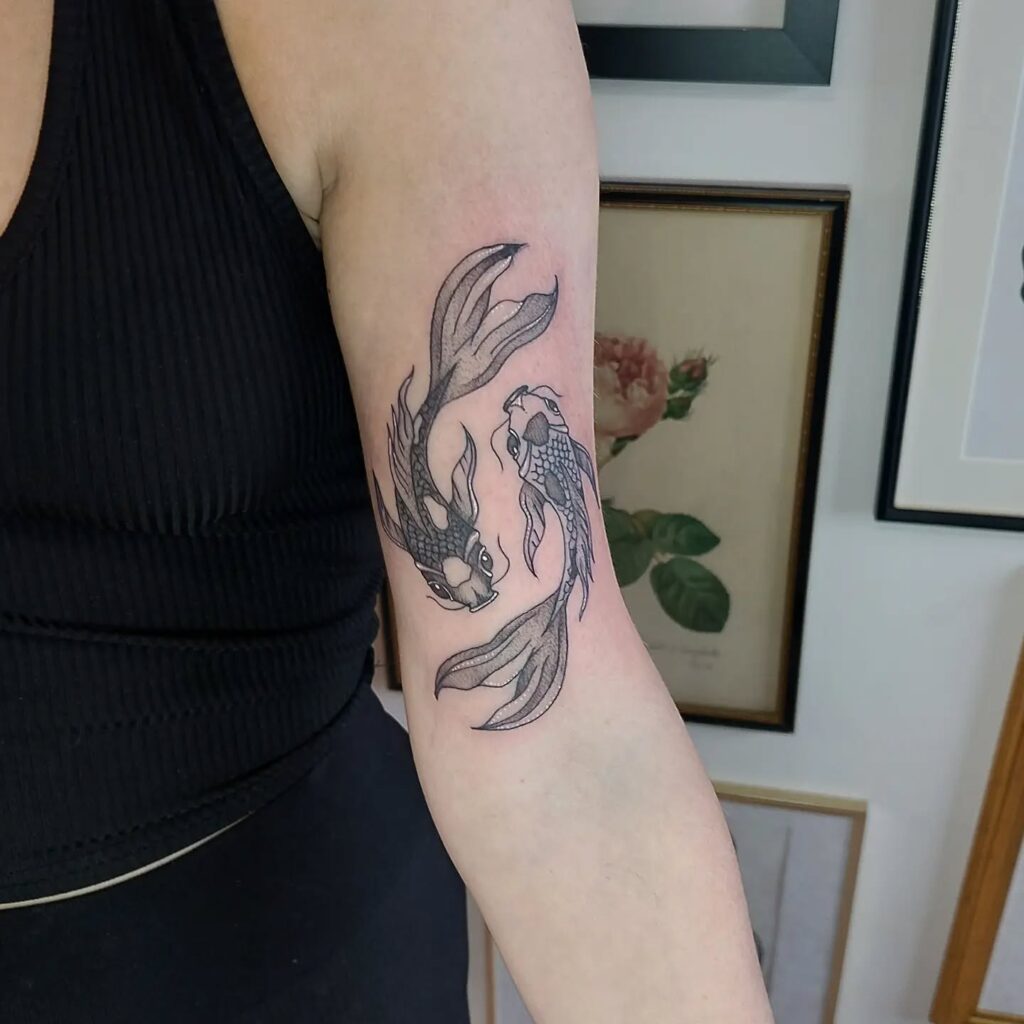 This stunning upper arm tattoo features two elegant koi fish swimming in a gentle circular flow. Delicate black-and-gray shading enhances their intricate scales and graceful fins, creating a sense of lightness and movement.