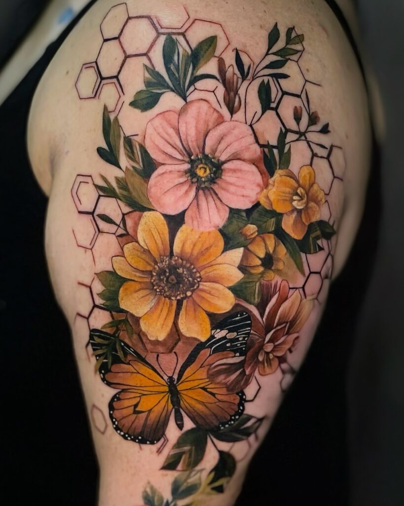 This stunning upper arm tattoo features a bright bouquet of orange and pink blooms accented with rich green leaves. A bold monarch butterfly with intricate wing details rests gracefully at the bottom, bringing movement and life to the piece.