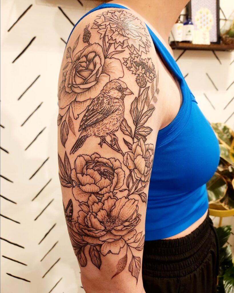 This beautiful upper arm tattoo features a delicate sparrow perched gracefully among intricate blooms and lush foliage.