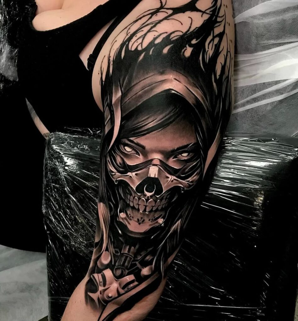 This bold, dramatic upper arm tattoo features a mysterious hooded woman with glowing eyes and a skull mask covering the lower half of her face. The intricate black-and-gray shading enhances the intensity of her stare, while wisps of shadow and flowing hair surround her in dynamic movement.