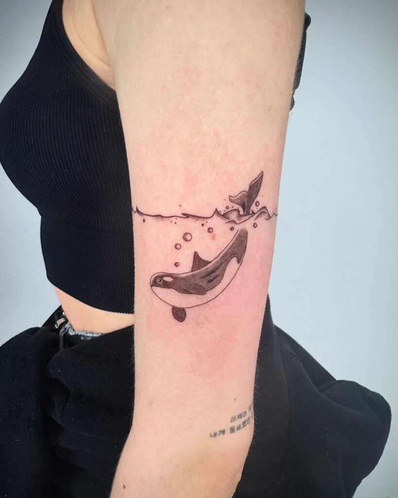 This sleek upper arm tattoo features a graceful orca gliding just beneath the water’s surface. The fine, clean lines and subtle shading capture the gentle movement of the ocean, while playful bubbles and a smooth waterline add a touch of realism.