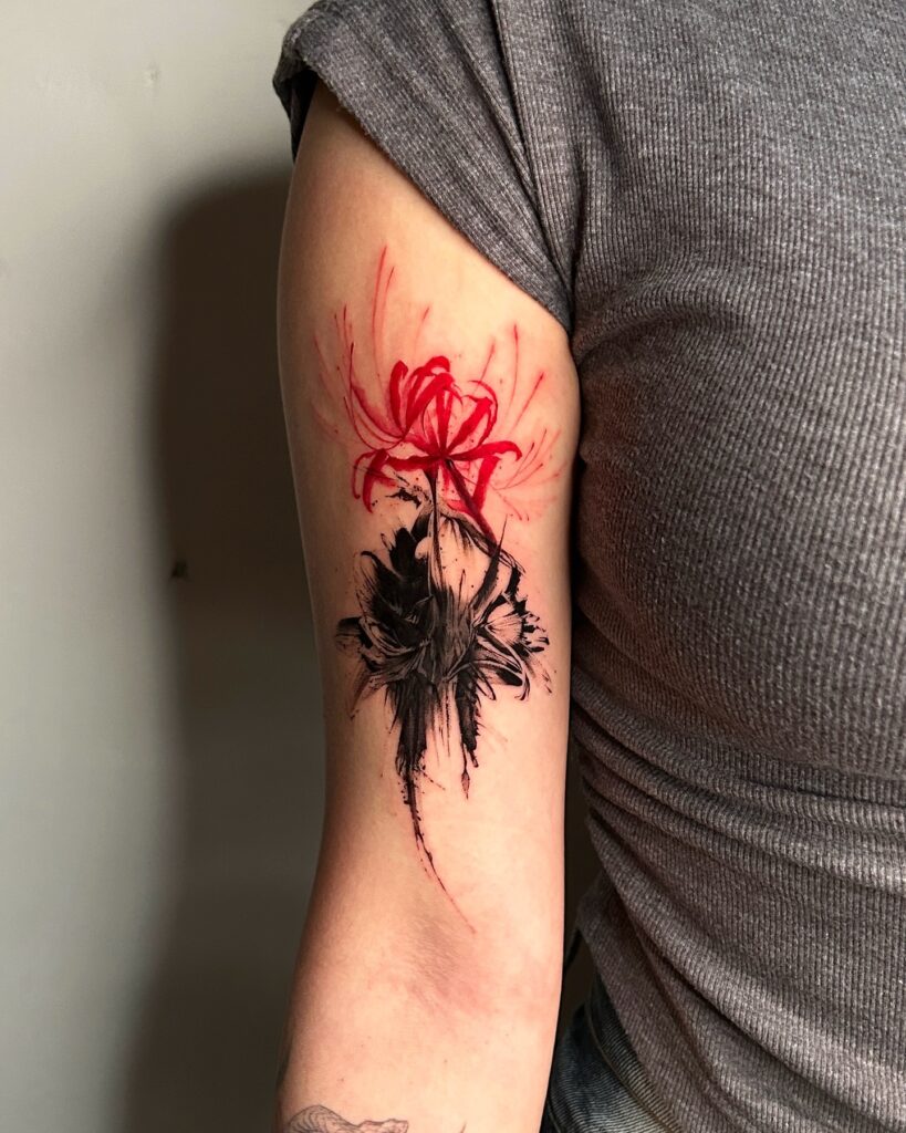 This striking upper arm tattoo captures the beauty of a red spider lily in a bold, abstract style. The vivid red petals flow outward with fine, energetic strokes, creating a sense of movement and lightness.