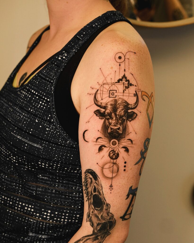 This intricate upper arm tattoo features a powerful bull at its center, framed by bold geometric lines, circles, and delicate dotwork. Surrounding the bull are cosmic elements like moons and orbits, creating a harmonious balance between nature and the universe.