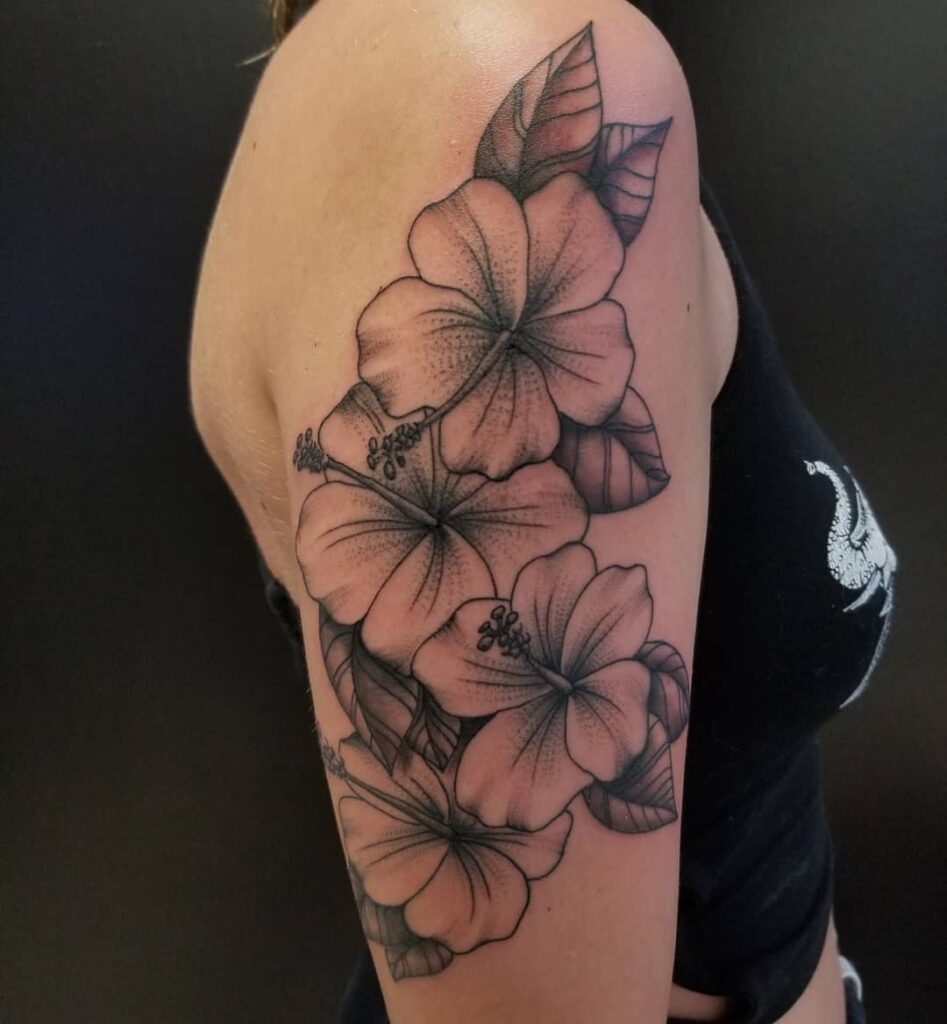 This gorgeous upper arm tattoo features a cascading cluster of hibiscus blooms paired with bold, leafy accents. The soft shading and delicate dotwork bring each petal to life, creating a sense of softness and depth across the design.