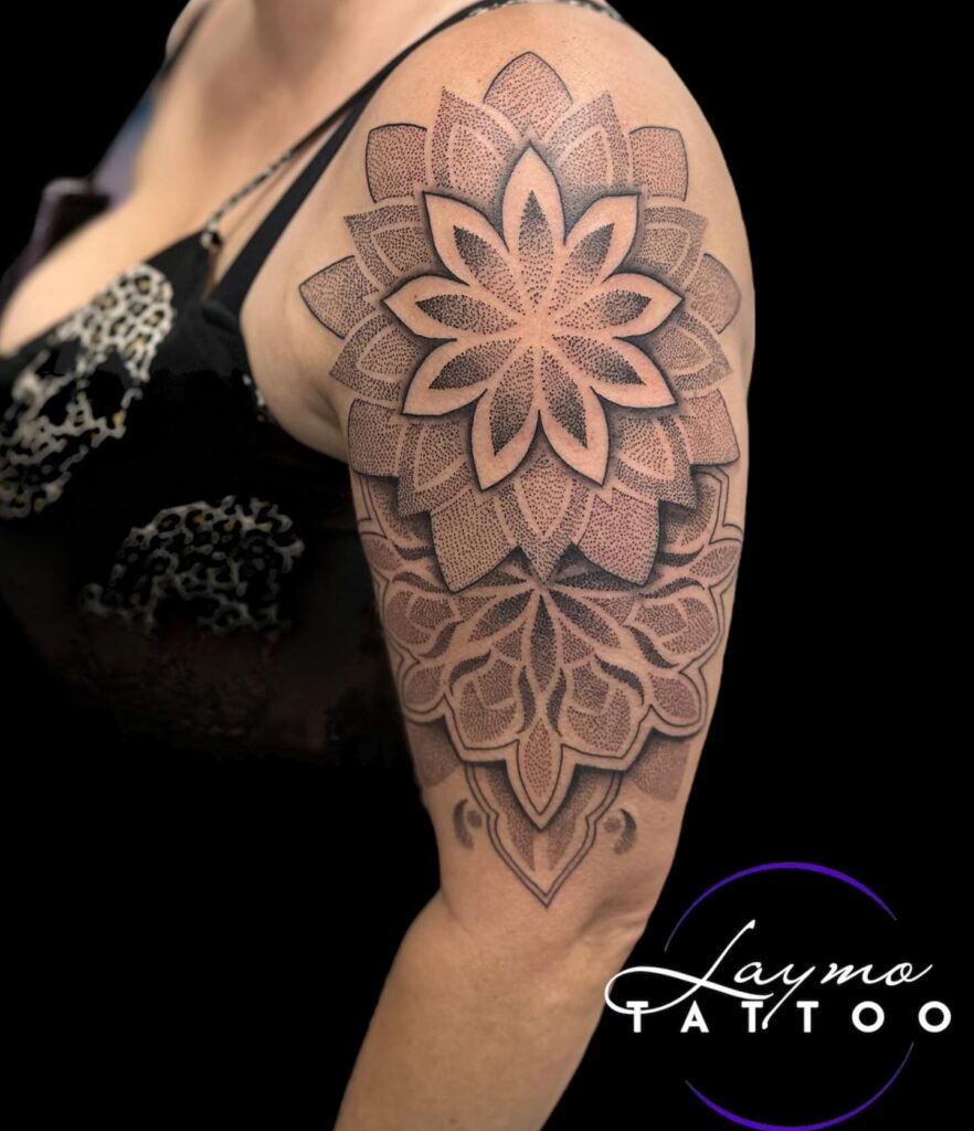 This intricate mandala tattoo gracefully wraps around the upper arm, creating a bold and elegant statement. Designed entirely in dotwork style, the layered petals and symmetrical shapes add a mesmerizing depth and softness.