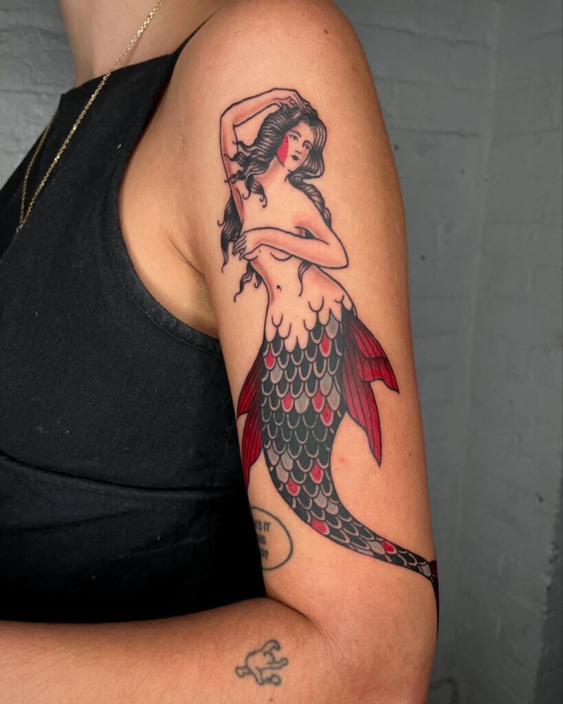 This striking upper arm tattoo features a bold, traditional-style mermaid with long, flowing hair and a scaled tail. Deep red and black ink create eye-catching contrast, while the classic, old-school linework gives the design a timeless feel.
