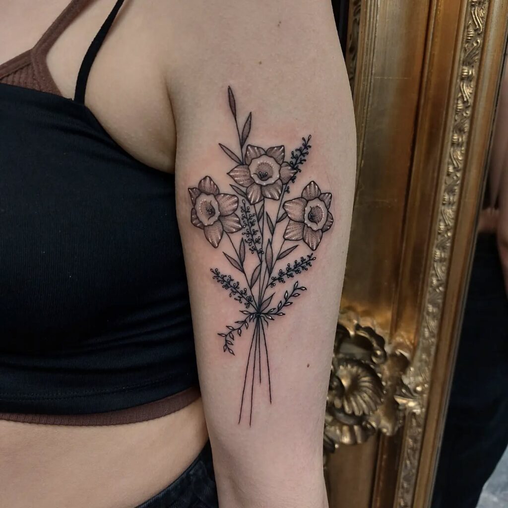 This graceful upper arm tattoo features a bunch of three daffodil blooms arranged with fine, wispy stems and delicate sprigs of foliage. The intricate black-and-grey shading brings subtle depth and softness to each petal, allowing the natural beauty of the daffodils to stand out.