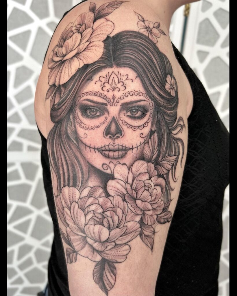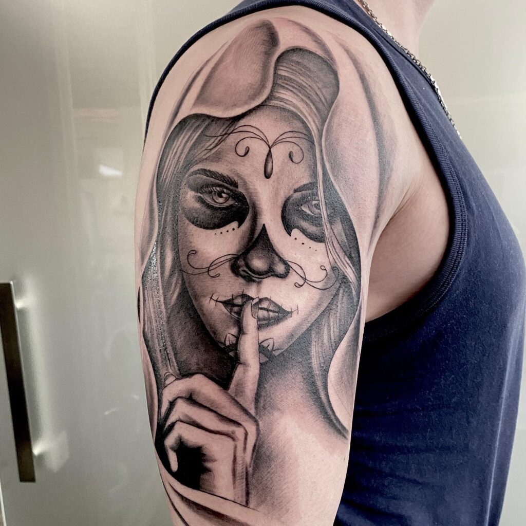 This striking upper arm tattoo depicts a captivating woman with sugar skull makeup, her gaze intense and mysterious. A flowing hood frames her face, and intricate details accentuate the traditional Day of the Dead style.