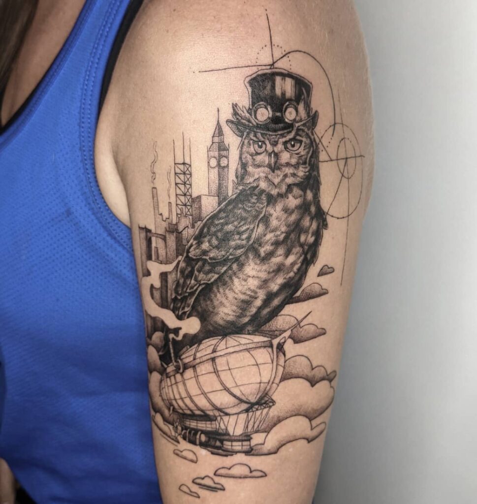 This stunning upper arm tattoo features a highly detailed owl with a vivid, glowing yellow eye that commands attention. The deep shading and realistic texture in the feathers give the owl an incredibly lifelike appearance.