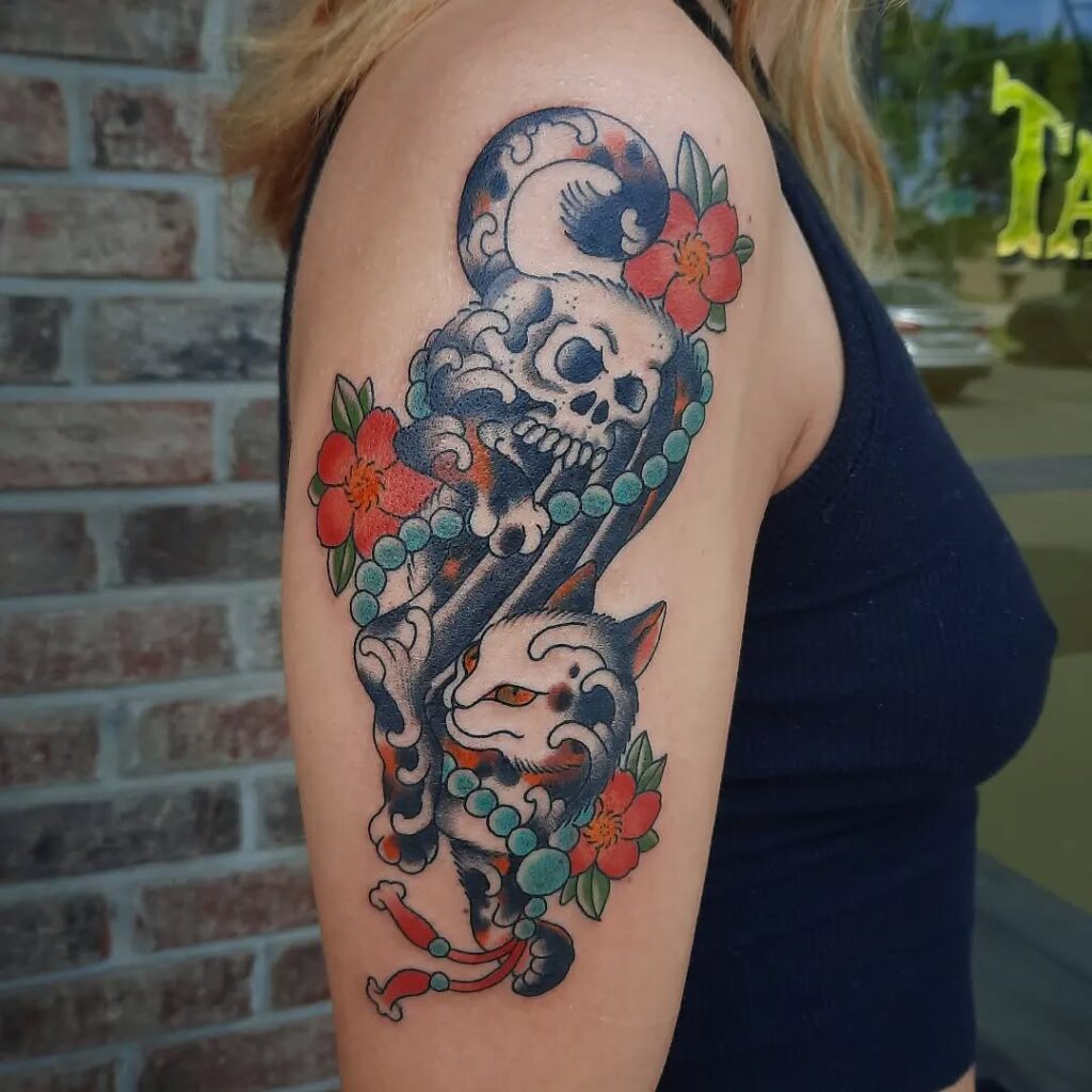 The sequence emphasizes the light, carefree movement of the cat, creating a sense of fluidity and joy. This charming tattoo is perfect for those who appreciate feline humor and want a fun, eye-catching design that celebrates the gentle chaos of a cat’s antics.