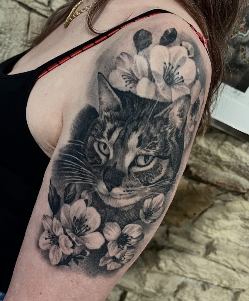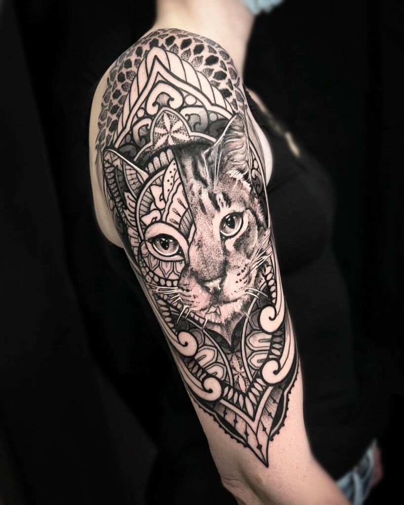 This stunning upper arm tattoo features a captivating combination of realistic and ornamental elements. At its center is a beautifully detailed cat face, rendered with fine shading and dot work to capture its piercing gaze and lifelike texture.