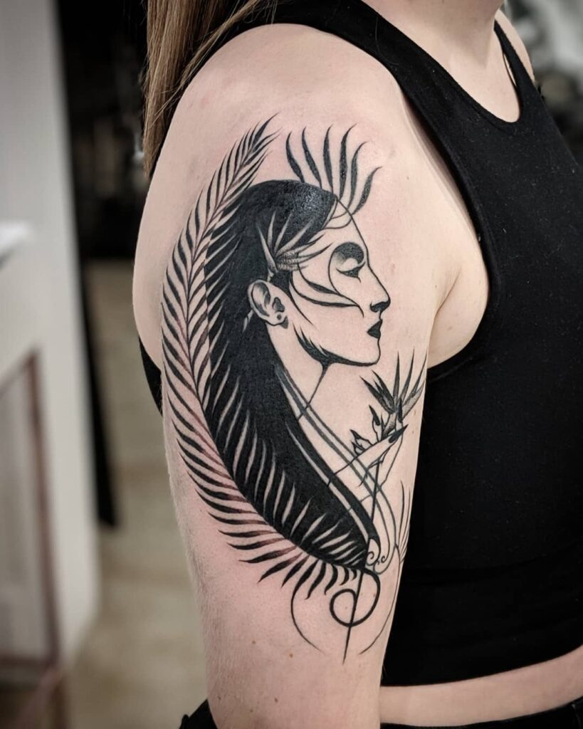 This bold upper arm tattoo features a stylized woman’s face in profile surrounded by dynamic palm leaves. Thick black lines and sharp angles create a graphic, modern aesthetic that feels both elegant and dramatic.