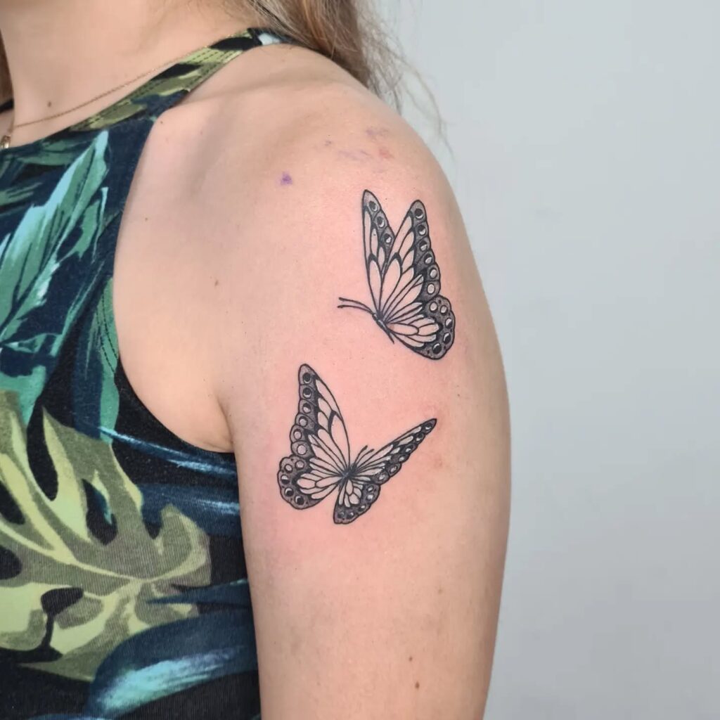 This charming upper arm tattoo features two graceful butterflies rendered with fine, clean linework and soft shading. The wings showcase intricate details, with delicate shapes and subtle patterns that give each butterfly a sense of lightness and motion.