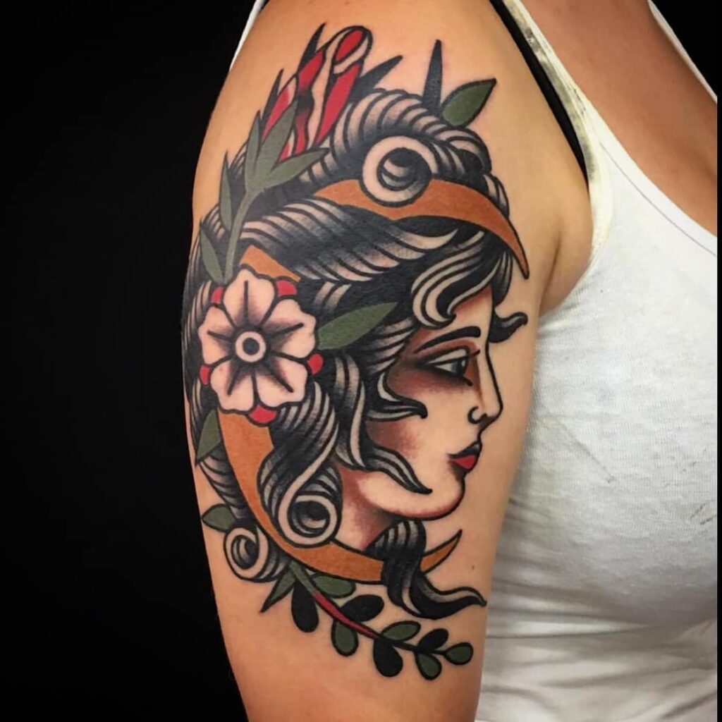 This bold and striking upper arm tattoo features a classic portrait of a woman’s profile surrounded by a crescent moon and adorned with vibrant foliage. Thick, crisp black outlines and rich shading highlight her graceful face, while lush green leaves and a stylized pink flower add a pop of color.