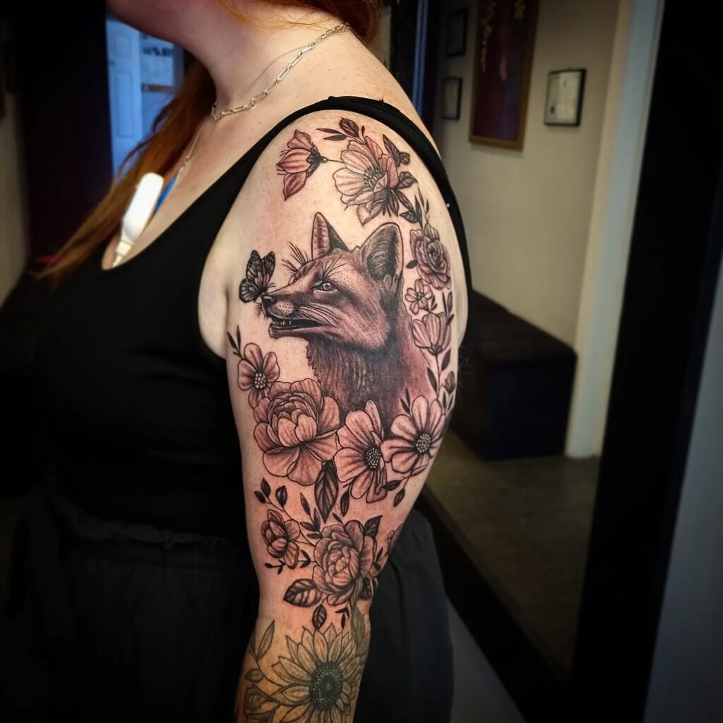 This graceful upper arm tattoo features a beautifully detailed fox surrounded by an abundance of blooming flowers. The fox’s sharp eyes and soft fur add a sense of life and curiosity, while delicate butterflies fluttering around enhance the gentle, natural theme.