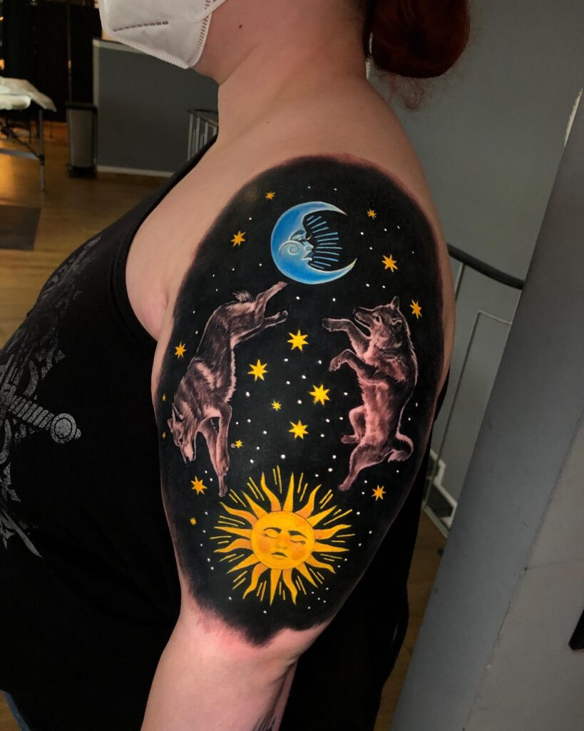 This vibrant upper arm tattoo paints a mesmerizing celestial scene. Two playful wolves leap toward a serene blue crescent moon surrounded by glowing yellow stars, their bodies shaded in rich black and gray tones for realism.