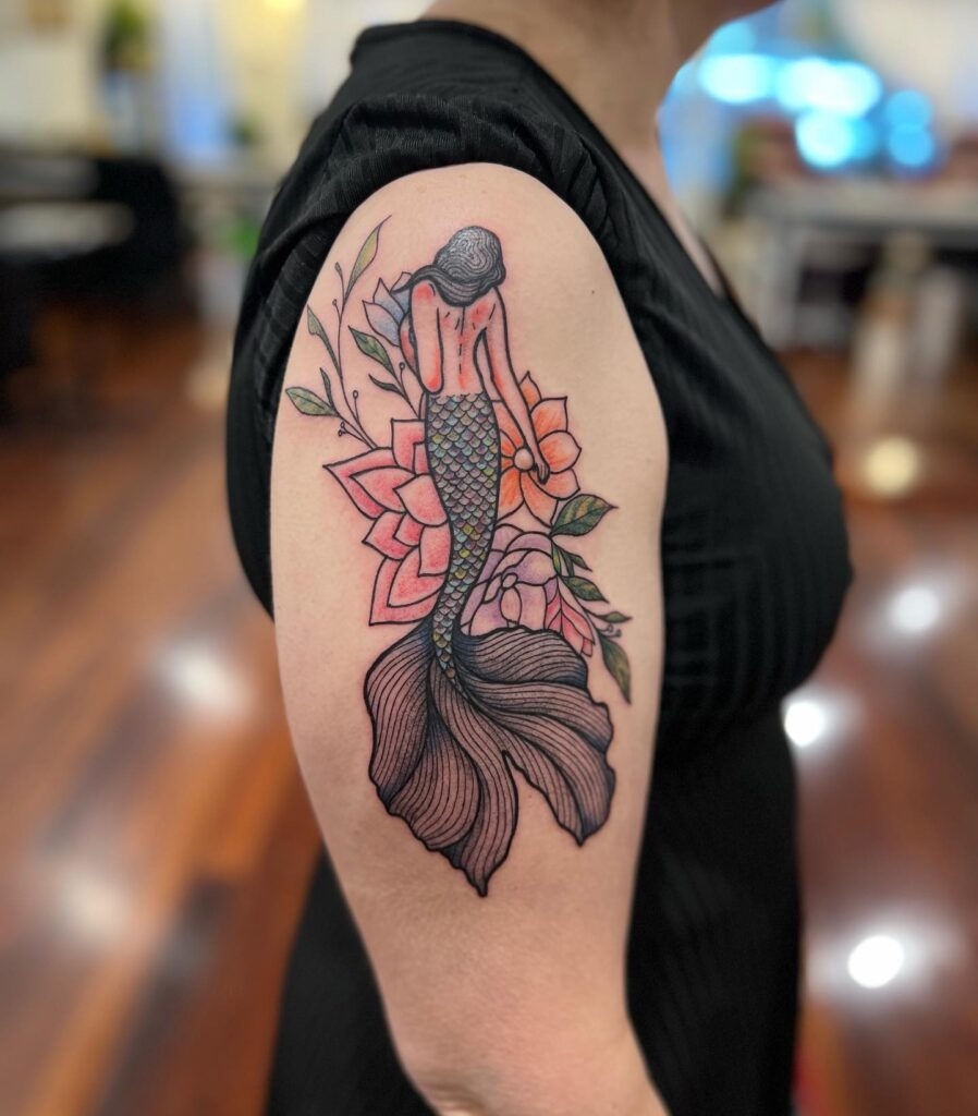 This enchanting upper arm tattoo features a serene mermaid with her back turned, her long hair cascading over shimmering scales. Surrounding her are lush flowers and delicate greenery, bringing color and softness to the design.