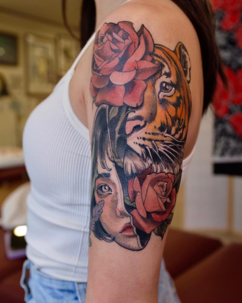 This captivating upper arm tattoo blends a fierce tiger with lush roses and a woman’s face into one vivid composition. The tiger’s bold orange tones and piercing gaze add a powerful, wild energy, while the soft red roses bring warmth and beauty.